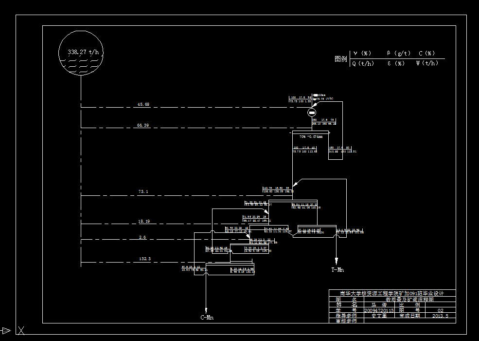 在收集湘潭某锰矿选矿厂相关设计资料的基础上,确定了各车间的工作 制度,对设计工艺流程进行了选择和论证,确定了设计的工艺流程,即:破碎采用三段一闭路流程,磨矿采用检查分级的一段磨矿流程,浮选采用一段一循环浮选工艺(包括一次粗选,一次扫选,三次精选的流程作业)。锰精矿采用先浓缩后过滤的两段脱水工艺流程。