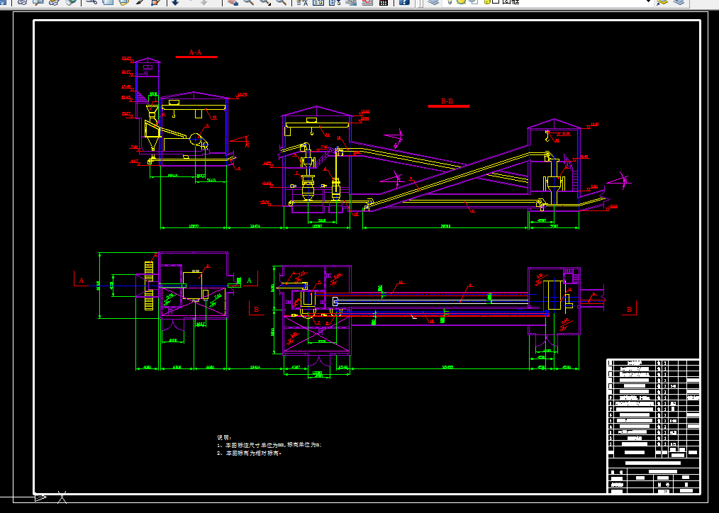 进行了厂房总体布置,并进行了厂房内的设备配置。根据选厂的地形条件,沿山坡地布置,其中,粗碎、中细碎、筛分厂房分开布置,粗碎、中、细碎及筛分车间平行等高线配置。磨矿浮选共厂房配置,其中磨矿采用纵向配置,浮选机采用横向配置。浓缩机配置在露天,过滤机与精矿仓配置在厂房内。完成了破碎筛分、磨浮、脱水车间平断面图、数质量矿浆流程图和设备联系图共5张。