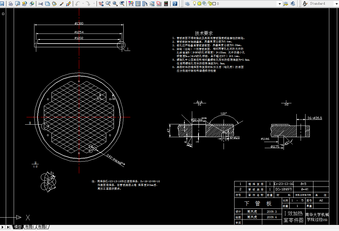 另外,由于本次设计的设备处理的介质是具有腐蚀性烧碱溶液,所以在一些与烧碱有接触的零件的选材时,一般都用到不锈钢0Cr18Ni9。而在管板的设计中,考虑到管板只有一侧与碱液有接触,如果全用不锈钢,那么不经济也不好加工。所以本次设计管板采用复合钢板,在管板的计算中还是按照一种材料进行计算和校核。