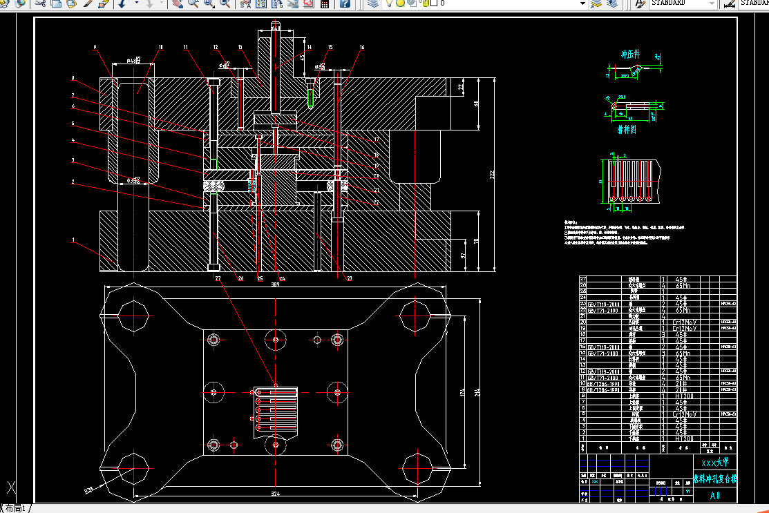在说明书中第一部分,主要叙述了冲压模具的发展状况,说明了冲压模具的重要性与本次设计的意义,对冲压件的工艺分析,工艺方案的确定。通过,对零件排样图的设计,完成了材料利用率的计算。再进行冲裁工艺力的计算和冲裁模工作部分的设计计算。最后对主要零部件的设计和标准件的选择,为本次设计模具的绘制和模具的成形提供依据,以及为装配图各尺寸提供依据。通过前面的设计方案画出模具各零件图和装配图。