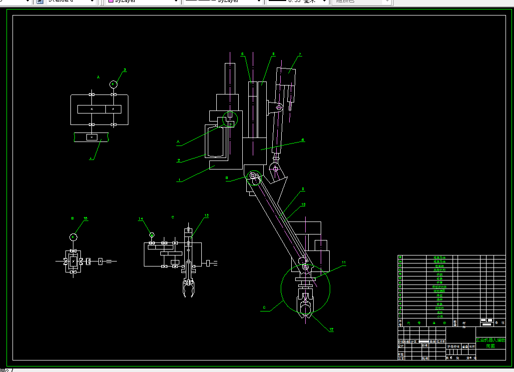 摘 要:数控机床上专用于工件和零件的夹持和自动运转的装置,其运动自由度多,且有严格的动作顺序要求。用液压驱动可实现动作自动循环,利于自动化和高效率等要求。机械手用于各种工艺装备上,其中包括组成柔性自动化系统的数控金属切削机床。工业机器人装备有自动可换夹持装置,其中双夹持器的装置用来保证同时操作毛坯和在加工的零件。本设计主要针对机械手的液压系统,确定液压系统中各个部分的功能,并且对各种执行元件进行计算分析,最终完成液压原理图。