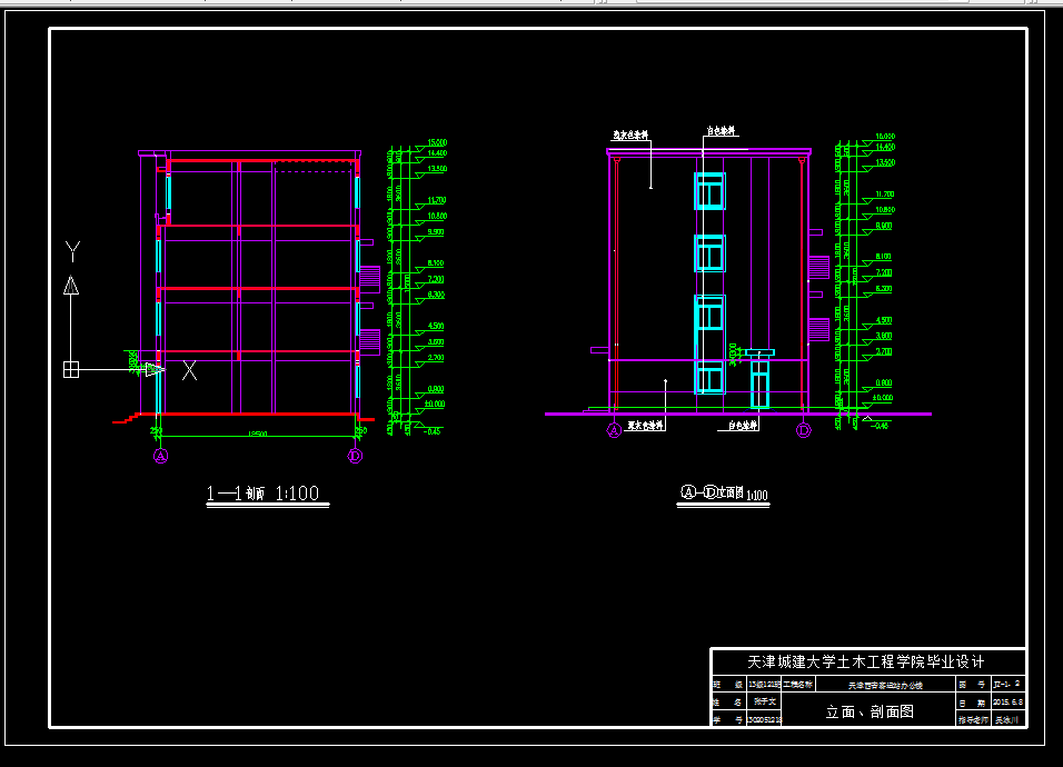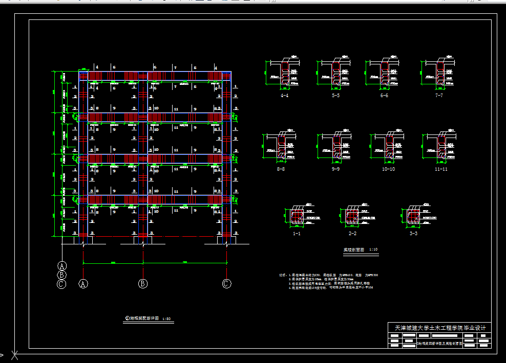 本设计中选取一榀主框架以及楼面及屋面板进行截面设计及配筋计算。首先根据框架布局及荷载规范初步确定各构件尺寸等,进行恒载、活载及风荷载的统计计算,然后进行竖向荷载作用下的结构内力计算,水平荷载采用底部剪力法进行计算,之后进行内力组合分析,并找出最不利的一组内力,进行构件截面配筋设计,最后根据计算结果,按照相应的构造要求,来绘制了部分结构施工图。关键词:结构设计;钢筋混凝土;框架结构;抗震设计;