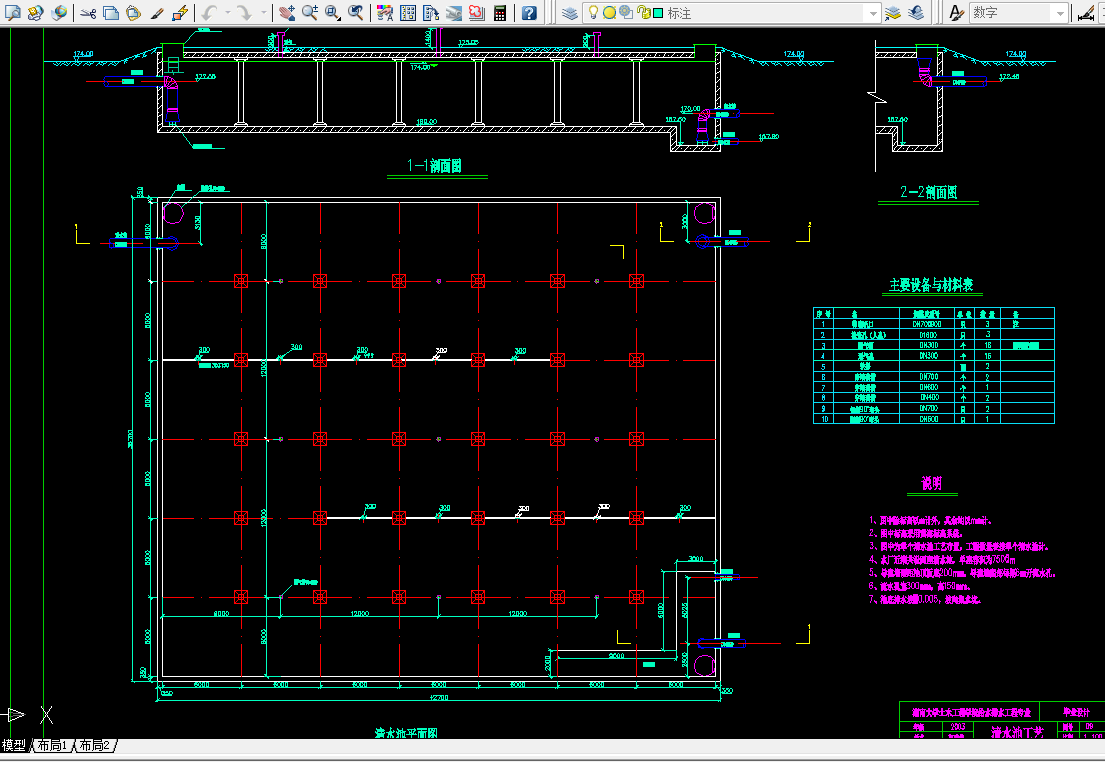 本设计的主要内容包括:取水构筑物设计;净水厂设计;输配水管网设计;工程总概算四部分。