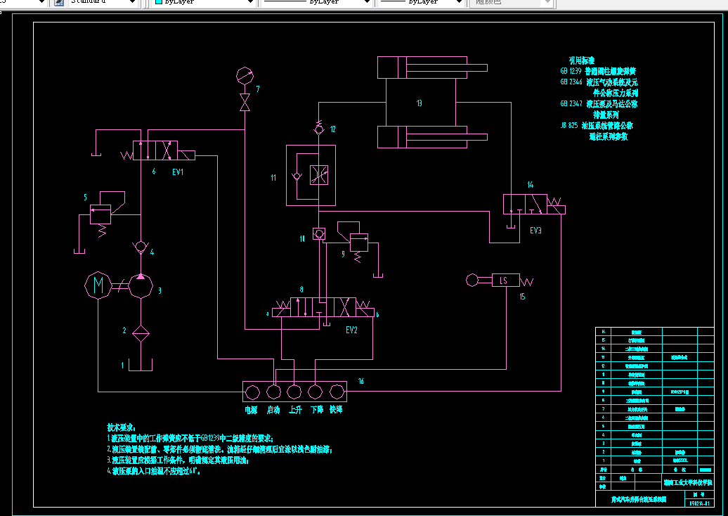 整机的液压系统图油路各自拟订好的控制回路及液压源组合而成。各回路相互组合时去掉重复多余的元件,力求系统结构简单。注意各元件间的联锁关系,避免误动作发生。要尽量减少能量损失环节,提高系统的工作效率。为了便于液压系统的维护和监测,在系统中的主要路段要装设有必要的监测元件,如压力表,温度计等。在设计中可以考虑在关键部位,附设备用件,以便意外事件发生时能迅速更换,保证主机连续工作。各液压元件采用国产标准件,在图中按国家标准规定的液压元件职能符号的常态位置绘制。对于自行设计的非标准元件可用结构原理图绘制