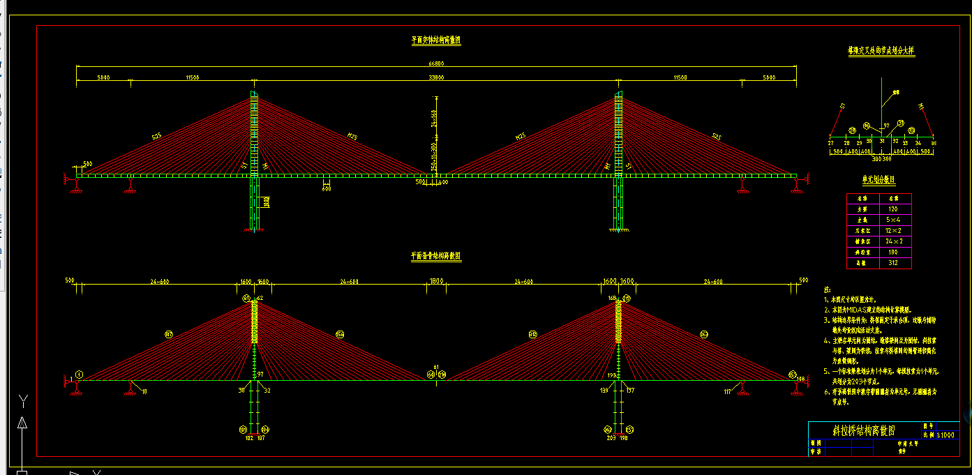 本设计为墩、塔、梁固结的单索面预应力混凝土斜拉桥,选择桥梁专用软件MIDAS来建模分析,计算该桥在自重、汽车、温度和支座沉降作用下的作用效应,并进行索塔的作用效应组合;但是,在自重作用下,成桥状态斜拉索的受力很不合理,故采用影响矩阵法对索力进行优化;再根据调整后的索力确定拉索的构造和下料长度;由于斜拉索水平分力的作用,索塔锚固区的混凝土会开裂,须在塔壁内配置闭合预应力筋。