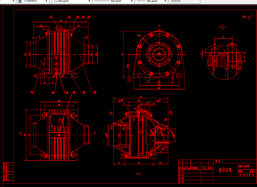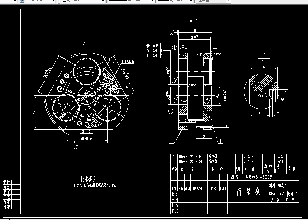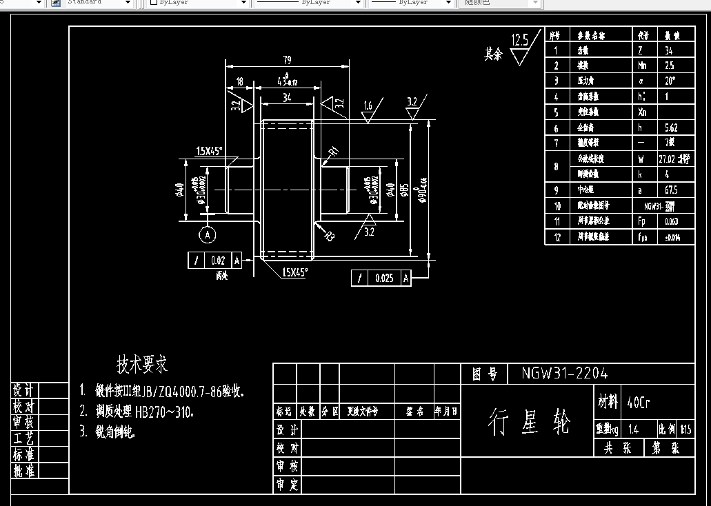 本设计是将一对NGW行星减速器的结构设计,形成一个组合机构,用来传递两相交轴之间的运动和动力,并实现较大的传动比。对齿轮与中心轮组合的受力状况分析时,应引入不均载系数根据传动,工作扭矩,载荷,根据级数转速要求计算出齿轮的齿数,模数,分度圆直径,计算出传动齿的齿厚,齿面硬度,选择齿形,根据上述要求选定达到此要求的材料,并且做出经济效益最好的选择,再根据此材料的弹性影响系数,各传动齿轮接触疲劳强度极限,再对材料的选择正确与否做出校核,并且要满足减速器的使用寿命要求,根据载荷和传动扭矩计算传动主轴的直径及定位,计算中心距,确定行星轮系的周转圆半径及方向,并指定轮系的旋转方向,得到各项数据后,依据设计要求结构大小,确定各部件相对位置,进入外箱体的设计,秉承体积最小,拆装方便的原则,定好主轴位置,窥视孔,润滑口在箱体上的位置,便于维修判断。除齿轮以外,对于承受工作载荷的其他零部件如轴、键、轴承等、也进行了设计校核。减速器箱体采用法兰式结构,用以满足工作环境的安装条件。减速器高速级为圆锥齿轮传动,以实现换向。由于功率、传动比较大,将这对圆锥齿轮设计为斜齿圆锥齿轮。低速级采用NGW行星机构进一步增大传动比,NGW行星机构可以传递较大的功率以及实现较大的传动比,因此在设计中采用直齿圆柱齿轮。