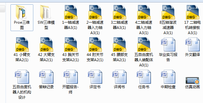 本次毕业设计设计了一个五自由度串联机器人。大致流程如下:首先计算出执行端所需要的驱动力矩,再由此选出该关节所需的伺服电动机和减速器,设计出机壳和关节的连接结构,绘制3D图,做出三维动画,通过软件的测量求出设计好的部分重心,求出下一个关节所需的驱动力矩,选出所需的减速器和伺服电动机,以此类推最终完成总体设计,并且绘制了串联五自由度机器人的工程图。