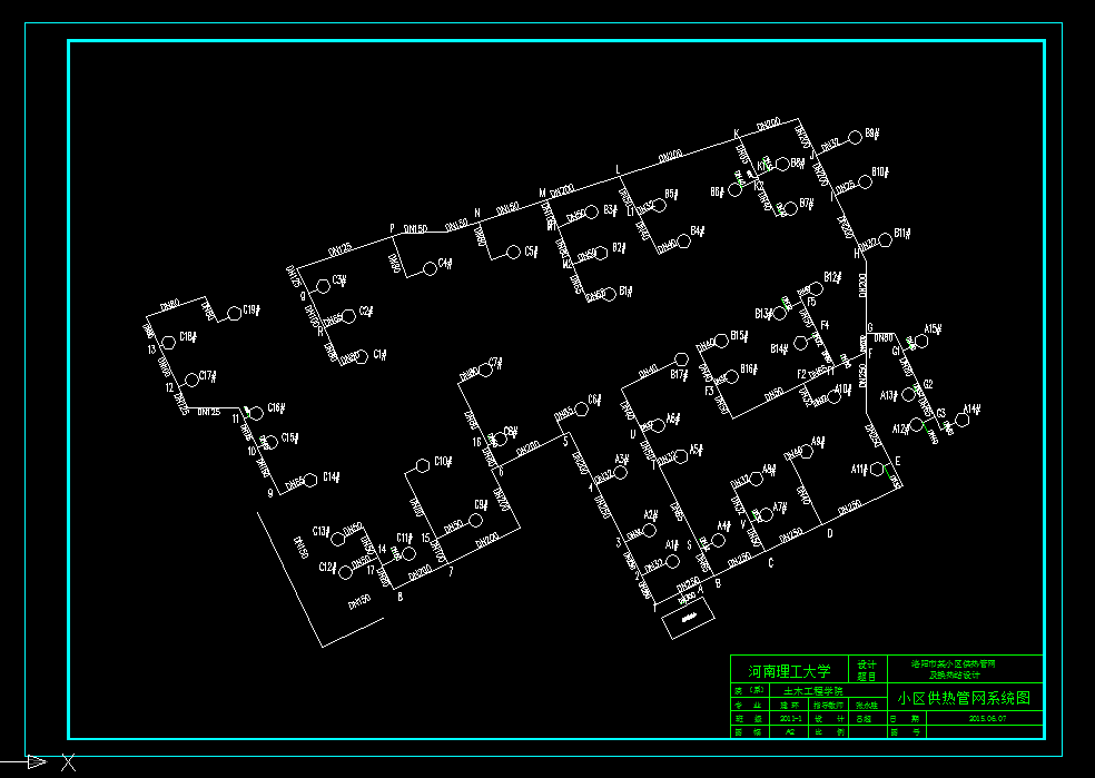 小区一次水供回水温130℃/80℃,二次水供回水温80℃/60℃。管网布置为闭式双管异程式系统,枝状形式。采用补水泵定压方式,系统运行时,采用质调节调节方式,以适应热负荷的变化。整个管道均为无补偿直埋敷设,所有管段采用预制保温管,保温材料为聚氨酯,保护层为聚乙烯,由国家标准设计图集《管道及设备保温》98R418确定其保温层厚度,通过水力计算确定管径。小区设一个换热站,内设3台型号BR06A板式换热器,2台型号为IS200-150-400C的热水循环泵(一备一用),2台型号为IS50-32-200C的补水泵(一备一用),卧式直通除污器。整个网路由绘制的水压图可知网路压力工况均满足技术要求。