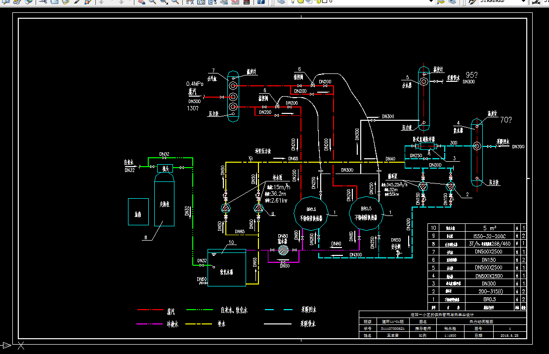 小区一次水供回水温 130℃/80℃,二次水供回水温 95℃/70℃。管网布置为闭式双管异程式系统,枝状形式。采用补水泵定压方式,系统运行时,采用质调节调节方式,以适应热负荷的变化。整个管道均为无补偿直埋敷设,所有管段采用预制保温管,保温材料为聚氨酯,保护层为聚乙烯,由国家标准设计图集《管道及设备保温》98R418 确定其保温层厚度,通过水力计算确定管径。小区设一个地下换热站,内设 2 台型号 BR0.5 板式换热器,2 台型号为 200-315(I)的热水循环泵(一备一用),2 台型号为 IS50-40-200C 的补水泵(一备一用),卧式直通除污器。整个网路由绘制的水压图可知网路压力工况均满足技术要求。