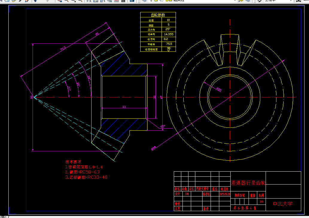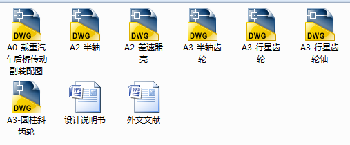 本次设计的内容包括有:主要围绕差速器、半轴齿轮及半轴进行设计,文中先是介绍了主减速器、差速器、半轴的种类、作用及原理,选取了螺旋圆锥-圆柱斜齿轮双级主减速器,普通对称式圆锥行星齿轮差速器以及全浮式半轴。然后对差速器、半轴的参数进行了计算,并进行了强度的分析。用AutoCAD软件绘制出了主减速器从动圆柱斜齿轮、行星齿轮、行星齿轮轴、差速器壳、半轴及半轴齿轮的零件图及相应的装配图。