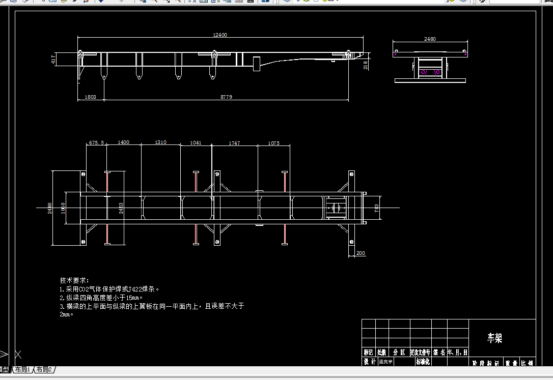 最后,对半挂车进行了总布置设计,使用UG建立了对应的三维模型。给出总布置图,并对关键零件车架做必要的分析,完成了相应的工程图纸。