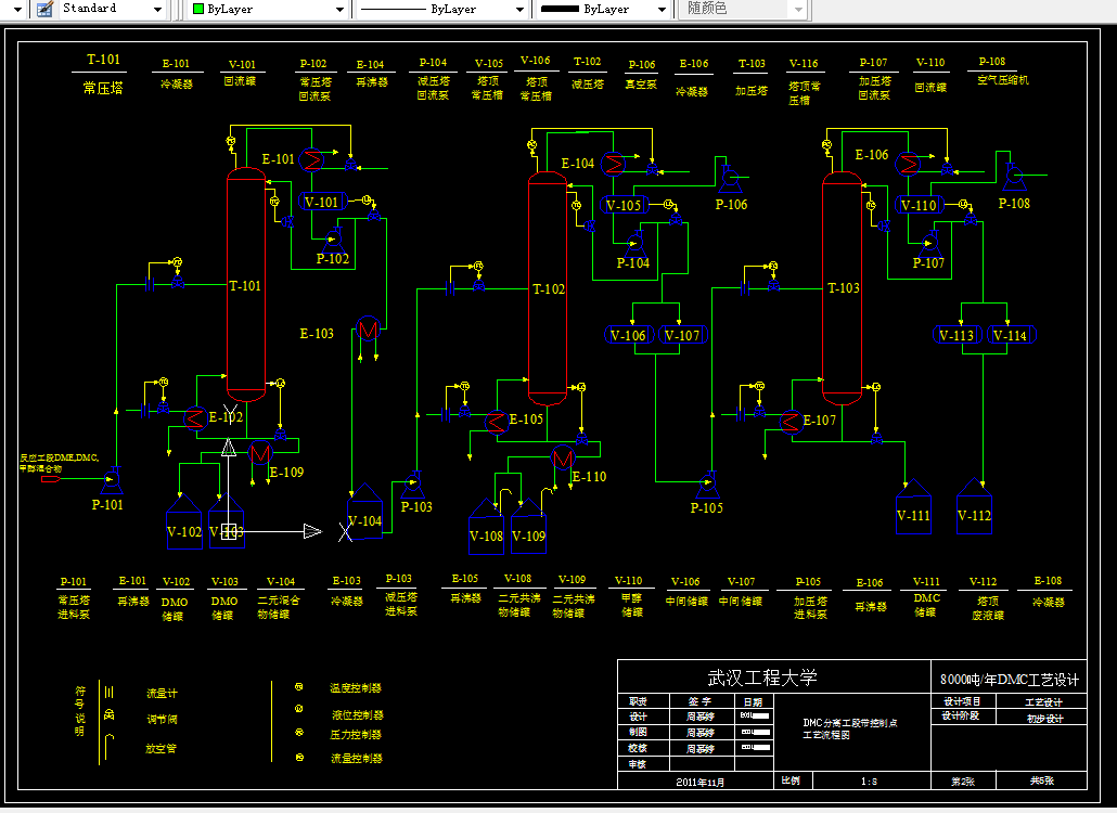 本课题是完成8000吨/年碳酸二甲酯合成工段工艺设计,主要原理是用甲醇、一氧化碳和氧气在催化剂作用下在固定床反应器进行氧化羰基化反应,再通过精馏塔进行产品的分离提纯。由于该反应是一个有机合成反应,主副反应同时进行,主反应产物为碳酸二甲酯DMC,副反应产生草酸二甲酯DMO,因此粗产品包括DMC、DMO和未反应完的 ,需进行三元物系的分离。考虑到三组分同为有机物,其相对挥发度相差较大,所以用精馏的方法分离。DMO最难挥发,用常压精馏塔将它首先分离出来;DMC和DMO能产生二元共沸物,先用减压精馏分离部分DMC,再用加压精馏将DMC和DMO彻底分离。除主要的工艺计算外,考虑到对实际生产有较好的指导作用和环境污染的问题,课题也要求进行生产工艺的经济核算、安全评价、生产工厂区域平面设计以及环境问题的分析。目前,国内还没有大型的碳酸二甲酯的生产线,而且碳酸二甲酯是一种重要的工业原料,具有很好的经济效益。该课题选用的氧化羰化制碳酸二甲酯工艺合成法是一种较为绿色的合成方法,虽然会有副产物DMO生成,但是这也是一种重要的化工原料,可以分离后产生良好的经济效益,同时该反应是一种原子经济反应,如果生产各个环节控制得当,不会产生过多环境污染,对目前化工生产有很重要的指导意义。