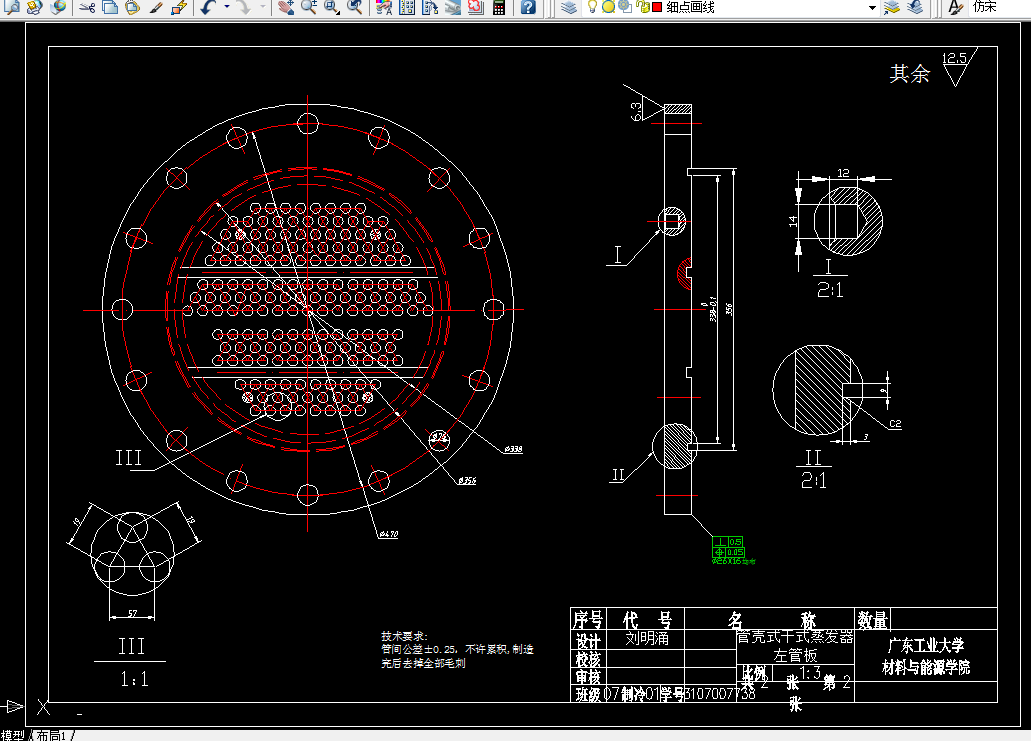 本次课程设计主要分为四个步骤:(1)通过对已知参数流量计算,由经验取制冷剂管内单位面积质量流速为: 初步规划蒸发器结构,为后来的理论设计计算提供依据(2)根据结构参数确定有效传热面积,通过计算管内管外换热系数,传热温差,进行传热面积校核,校验理论计算是否合理,若不合理通过改变换热管数改变换热面积,如果后者比前者少10%至20%,即符合要求。(3)根据需求的制冷量流量,冷媒水流量确定制冷剂和冷媒水的进出口面积,并进行选管。(4)结构机械性能计算及附件的选择,强度计算,螺栓、垫片的选择要严格按照国标,校核时按照国家压力容器安全技术标准来进行计算。最终完成了一个结构合理,满足要求,材料节省合理的壳管式干式蒸发器。