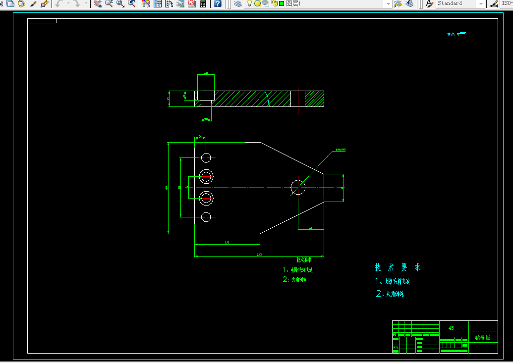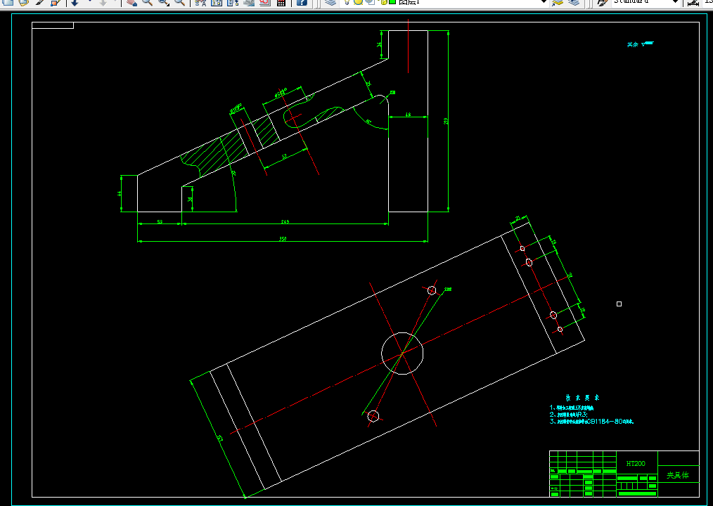 托架零件加工工艺及钻斜孔夹具设计是本次论文制作的内容。工艺和夹具两者的设计是本次毕设的主要内容。围绕着这两点进行展开制作。首要是对托架零件的结构分析和工艺方面分析。然后根据托架零件的结构以及形状进行工艺规程设计。工艺规程中确定每一个加工表面的加工方案。选择加工的定位基准。工艺中的工序加工余量的确定。工序的加工设备和刀具、量具等的合理挑选。通过查阅计算工序中的切削用量以及加工基本工时。最后,进行专用夹具的设计。设计的夹具要满足托架加工的技术要求,而且要制作一个合理的专用夹具,包括夹具的设计结构方面。要做到结构简单,便于操作。使得设计的夹具能够满足批量生产托架零件。在整个设计过程中包括了其他的制图、制表、文字编写、排版等设计。