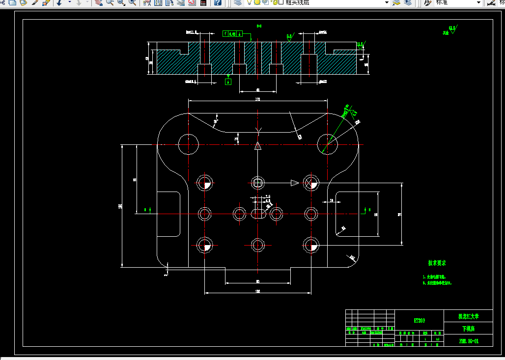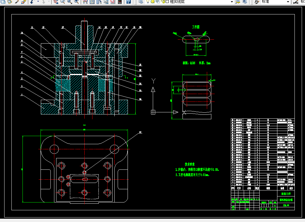 防转片在机械运转中主要起防止相邻部件的相对转动的作用。本文主要介绍了防旋落料复合模具的设计。从零件的可加工性分析开始,分析和比较各种加工方案,以确定最佳的加工方案。论文内容还包括零件工艺计算方面包括刃口尺寸计算,排样计算,冲压力计算,标准模架的选用,卸载装置中弹性部件的计算决定了其他部件的结构,并绘制了模具装配图和模具部件图。此次毕业设计让我对模具知识以及机械行业有了更深了认识,同时锻炼了自行设计的能力。