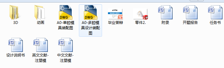 此次设计中,对单腔和多腔模具都有详细说明,大多数零件是采用标准件,目的是为了节省模具的制造成本,加快生产率。设计中借助了Auto-CAD、Creo、SolidWorks等计算机绘图软件的应用,使画出的装配图、零件图表示更清晰,加快设计速度。