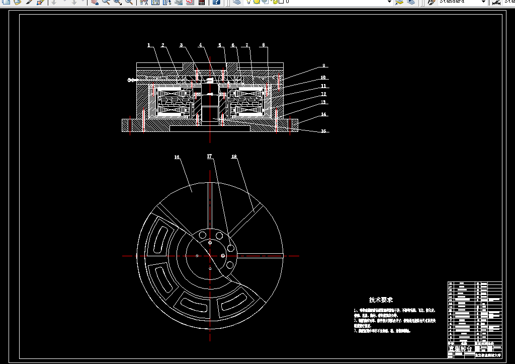 本文中的转台应用了直驱技术和静压技术,是集成创新设计。直驱部分采用盘式电机。盘式电机轴向尺寸短,重量轻,体积小,结构紧凑;由于采用永久磁钢激磁,转子无损耗,电机运行效率高。静压系统部分,轴向采用恒压式供油油腔,可以有效地消除传统转台驱动方式下由摩擦和振动引起的多种误差,提高了转台的精度,改善了动态响应特性。径向采用径向静压轴承,具有回转精度高、刚性较高、转动平稳、无振动的特点,广泛用于超精密机床。同时转台还配有检测、冷却、锁紧机构,以保证转台的精度和稳定性。