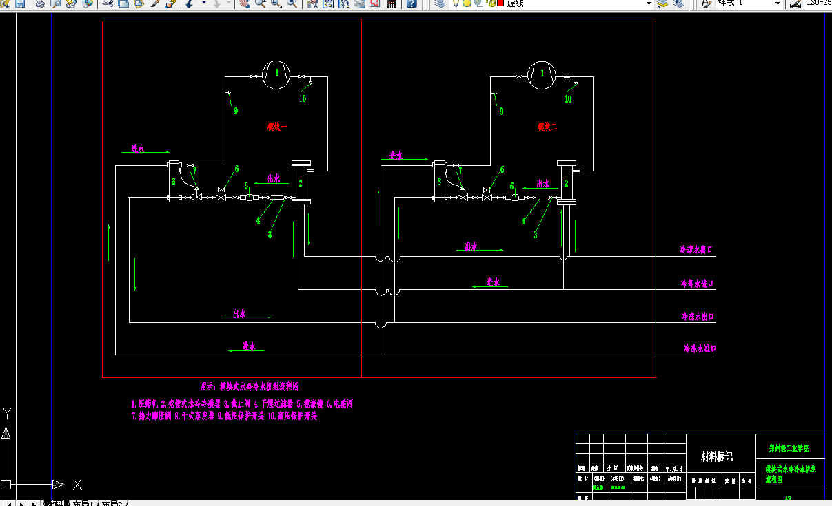 本论文设计的是制冷量为60kW的模块式水冷冷水机组。制冷系统四大部件分别选用了全封闭式柔性涡旋压缩机、卧式壳管式水冷冷凝器、干式蒸发器、以及热力膨胀阀。其中制冷剂为R134a,系统制冷量为60kW,冷凝温度40℃,冷却水进口温度30℃,出口温度35℃,过冷度5℃,蒸发温度2℃,过热度5℃,冷冻水进口温度12℃,出口温度7℃。