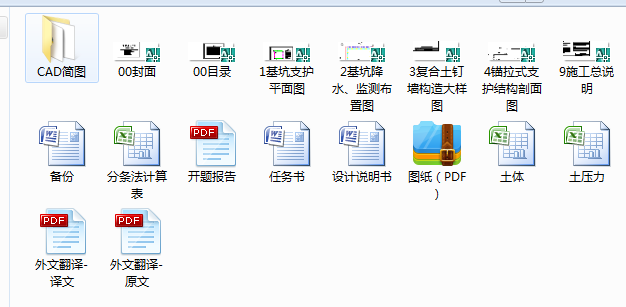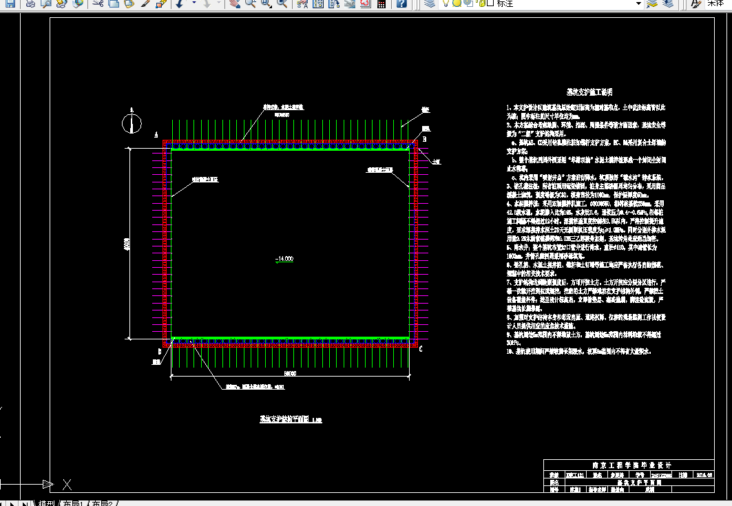 为满足基坑土方开挖及周围环境的安全性要求,该基坑支护结构的设计结合了工程地质勘查资料,分别在基坑南、北侧采用钻孔灌注桩+锚杆,在基坑东、西侧土钉墙支护,并采用双轴搅拌桩止水。本毕业设计说明书介绍了该深基坑支护设计的主要设计情况,并且罗列了基坑的施工监测方案及其施工组织设计。此外,还对支挡结构的内力、配筋、稳定性、降水进行了详细地计算,验证此设计方案的科学性和合理性。采用同济启明星软件对计算内容进行校核也是该毕业设计的主要内容之一。
