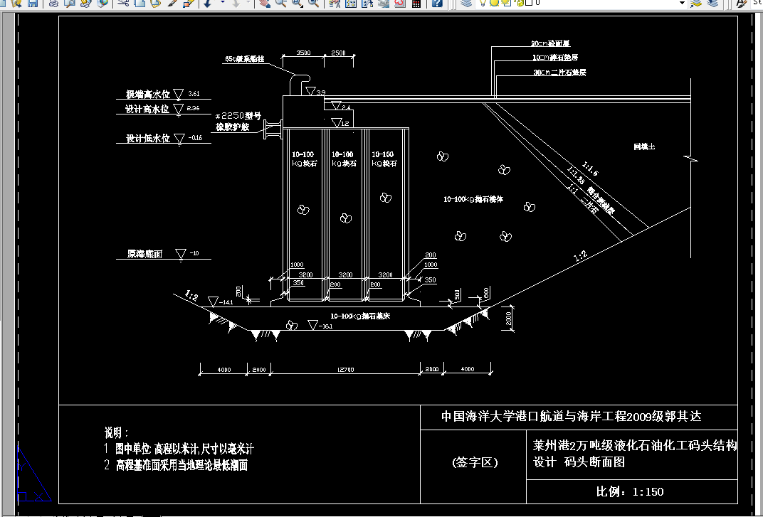 本设计为依莱州港现防波堤而建造的9号码头,是对莱州港的扩建工程。莱州港现有的泊位结构不适应目前货物品种的需要和港口安全生产的要求,为了满足目前以及长远发展需求,在满足施工条件及经济的条件下进行设计一个20000吨级液体石油化工码头,并兼顾未来可能要停泊的50000吨级油船。在设计过程中严格按照国家规范的标准,并经过多方面验算,选定了重力式沉箱码头作为本码头的结构形式,设计人员严格按照规范技术等方面的要求,并考虑经济、选材等多方面的因素,经过内力计算码头稳定性验算确定了码头的平面设计、沉箱结构形式、承载能力等,确定了码头施工的整体方案,下面为码头设计书。