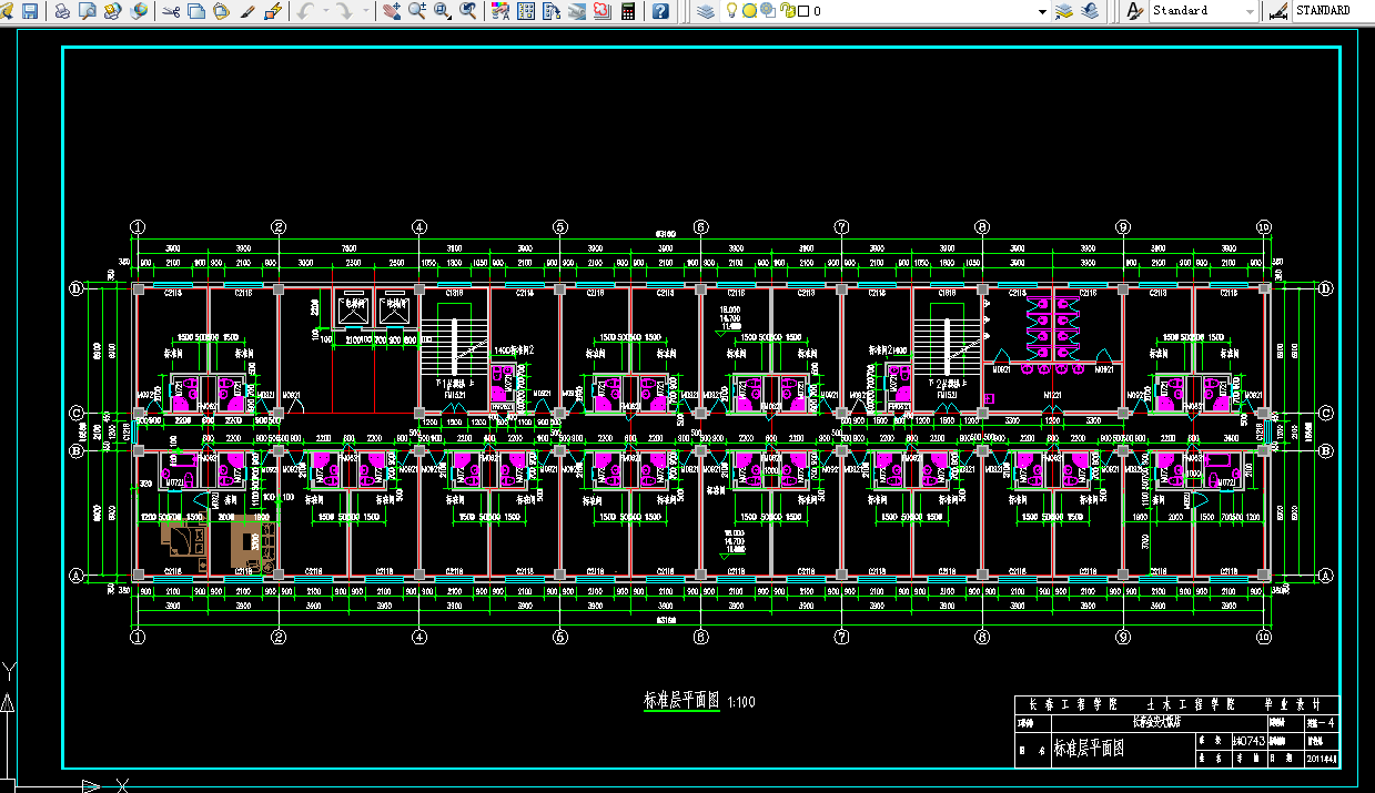 在结构设计中我们进行了板的配筋设计,一榀框架的设计以及楼梯,基础的配筋设计,在框架结构的设计,我学习建筑的荷载收集,分析结构和构件的受力,采用不同的方法分别计算出各种荷载作用下的内力,然后进行内力组合,挑选出最不利的内力组合进行截面的承载力计算,保证结构有足够的强度和稳定性。在对竖向荷载的计算中采用了弯矩分配法,对水平荷载采用了D值法,对钢筋混凝土构件的受力性能,受弯构件的正截面和斜截面计算,受压构件的承载力计算都有应用。