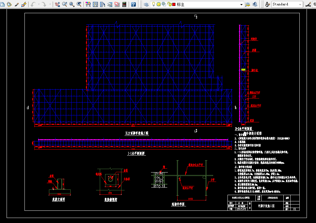 第一部分 脚手架专项施工方案,包括(1)脚手架施工计划:材料要求,外部脚手架构造以及搭接顺序。(2)施工技术:技术参数,施工方法,以及检查验收要求。(3)施工安全保障措施,劳动力计划。(4)脚手架计算书:对大横杆、小横杆、立杆、连墙件等的受力计算。