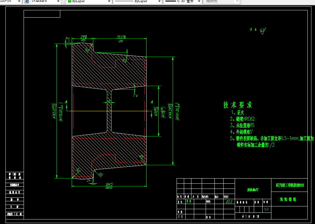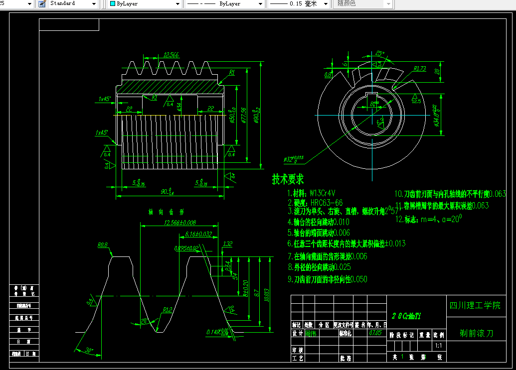 齿轮是机械系统中常用的一种传动零件,它可用来传递空间任意两轴间的运动和动力。它具有功率范围大、传动效率高、传动比较准确、使用寿命长、工作安全可靠等特点。当前,国际国内在汽车、拖拉机等行业的齿轮大批大量的生产中,常采用滚-剃-珩工艺。由于剃齿对齿轮齿形误差的修正能力有限,因此备用的剃前齿轮精度一般都不低于8级,剃前滚刀的精度一般制成A级,插齿刀的精度大都也制成A级。D85推土机齿轮有大小两个齿,根据该齿轮实际情况,大齿轮宜采用滚齿的加工方法,小齿轮采用插齿的加工方法,花键孔采用两次拉削的加工方法。齿轮滚刀是用于加工外啮合直齿齿轮和斜齿齿轮最常用的刀具,滚齿加工方法的生产效率比插齿、磨齿等加工方法高。剃前滚刀的主要作用是加工符合剃齿要求的剃前齿轮,由于剃前滚刀齿形的特殊要求,使剃前滚刀的设计比普通齿轮滚刀设计复杂得多,其设计效率低,周期长,计算工作量大,对设计者要求较高。拉刀也是机械加工中常用的一种刀具,拉削可加工内表面(如各种型孔、键槽、花键孔等)和外表面(如平面、半圆弧面和组合表面等)拉削加工效率高,精度高。花键孔加工宜采用两次拉削的方法,第一次采用梯形齿粗拉刀,第二次采用渐开线齿拉刀。