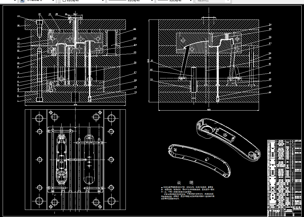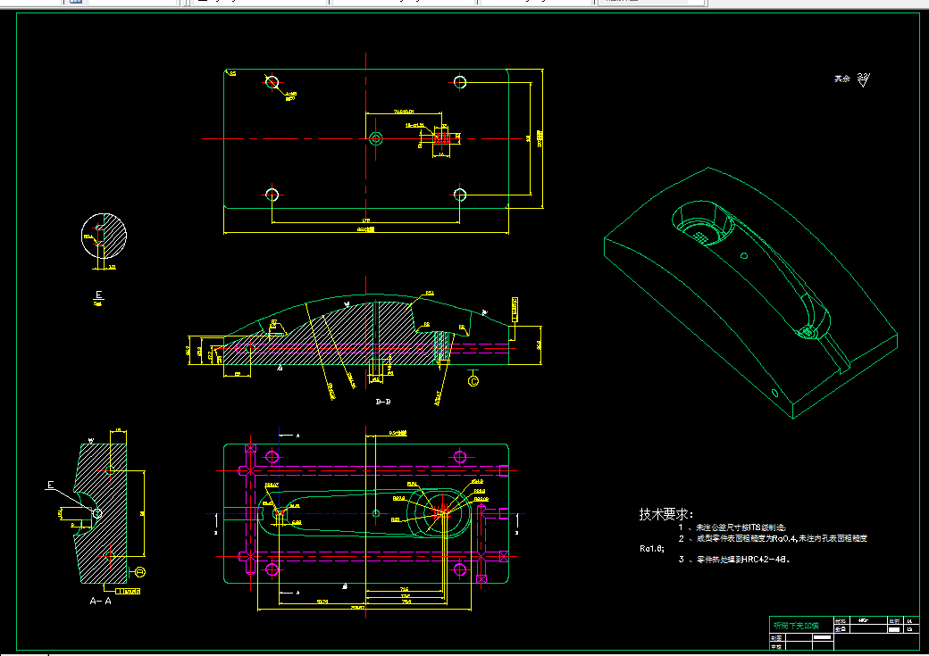 对注塑产品提出了基本的设计原则;通过对绕流板支架工艺的正确分析,设计了一副一模两腔的塑料模具。详细地叙述了模具成型零件包括前模板、前模仁、后模板、后模仁、后模镶件、斜导柱、滑块等的设计与加工工艺过程,重要零件的工艺参数的选择与计算,推出机构与浇注系统以及其它结构的设计过程,综合地处理好产品外观要求与浇口位置及脱模方式之间的问题,并对试模与产品缺陷作了介绍。