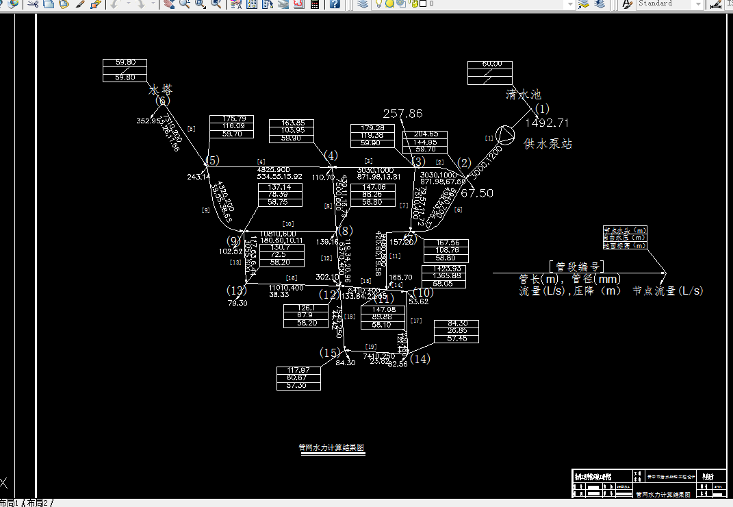 输配水的设计包括水泵的选用,泵房的安置,比流量的计算,流量分配的确定,及管网平差的计算,管网的定线。
