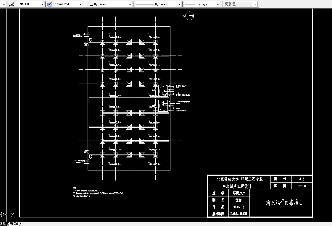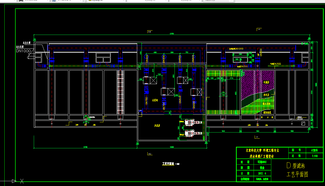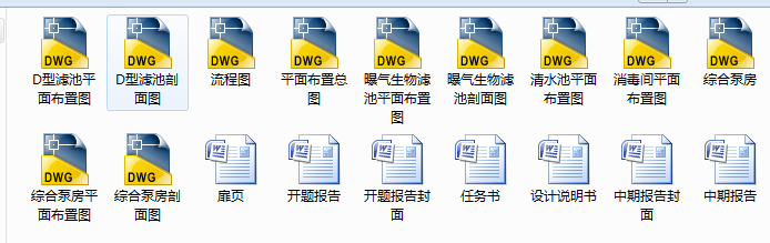 本设计主要内容包括两部分:第一部分为设计说明书,包括:国内外文献综述、常见工艺介绍和工艺选择、比对和论证。第二部分为图纸,包括:水厂平面布置图、高程布置图、曝气生物滤池平面图及剖面图、D型滤池平面图及剖面图、综合泵房平面图及剖面图、清水池平面图和消毒间平面图。