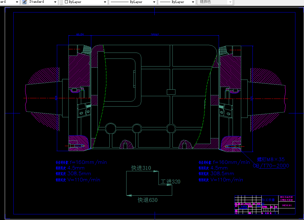 根据汽车变速箱的结构特点、加工部位、尺寸精度、表面粗糙度及生产率等要求,确定该机床为双工位卧式组合机床;考虑工件尺寸精度,表面粗糙度,切屑的排除及生产率等因素,选用硬质合金套式面铣刀;根据工件的尺寸、特点及其材料选择切削用量;然后,再经过切削用量来确定组合机床的通用部件;最后进行组合机床的总体设计。由于是粗铣柴油机汽缸体两端面,则夹具的设计采用“一面两销”定位, 液压夹紧,一次装夹加工柴油机汽缸体的两个端面,保证了加工精度,提高了生产效率。