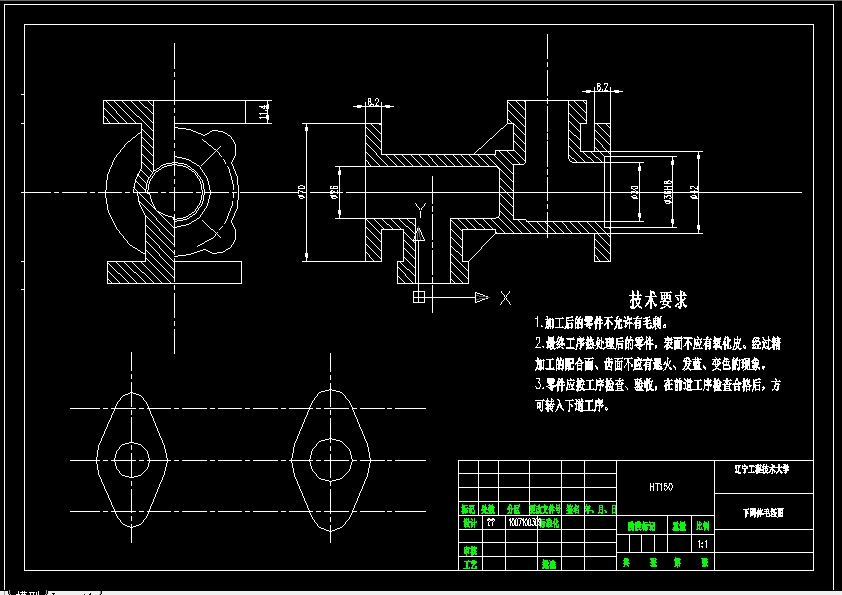 这次设计的是下阀体,有零件图、毛坯图、装配图各一张,机械加工工艺过程卡片和与所设计夹具对应那道工序的工序卡片各一张。首先我们要熟悉零件,题目所给的零件是下阀体。了解了下阀体的作用,接下来根据零件的性质和零件图上各端面的粗糙度确定毛坯的尺寸和机械加工余量。然后我们再根据定位基准先确定精基准,后确定粗基准,最后拟定下阀体的工艺路线图,制定该工件的夹紧方案,画出夹具装配图。