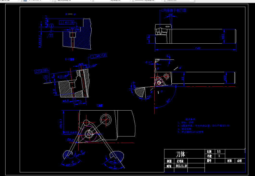 已知:工件材料45钢,使用机床CA6140,加工后dm=45,Ra3.2,需粗、半精车完成,加工余量自定,设计装F刀片950偏头外圆车刀