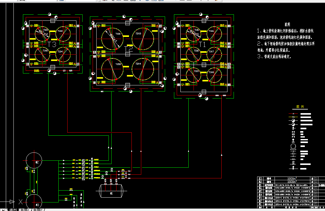 绘图部分依据计算说明、规范和经济因素,在满足生产要求的条件下,进行了较为经济合理的布局,并为油库将来的扩建和发展留有余地。