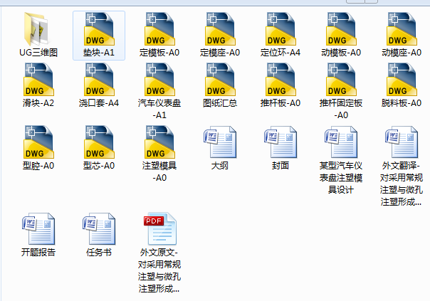 本次毕业设计论文,主要设计的是汽车仪表部件,仪表主要有4部分组成,透明罩子,塑料外壳,中壳和底壳组成。这次设计的是仪表的前壳,前壳主要是用卡扣,螺纹等连接底壳。在计划的过程当中,按照仪表的年产,选择及格的注塑机。选择好合适的注塑机,需要了解塑件的材料的性能,以及加工要注意的地方。经由过程计较选择适合的模板架。计划主流道,分流道,肯定浇口位置,以后计算出型芯,型腔的尺寸,冷却线路的计划。之后用ug8.0计划出模具的零件图,在装配起来。然后用ug软件,画出模具的装配图,以及各个部位的零件图,最后导出cad格式。论文书写的时候,需要把整个模具设计的思路,计算公式写清楚。