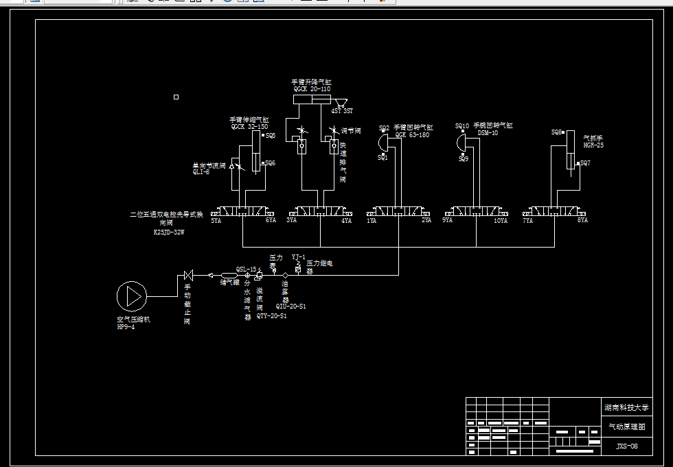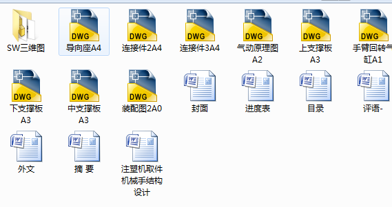 本文主要进行了气动机械手的总体结构设计、气动设计和运动设计。机械手的机械结构由气缸、气爪和连接件组成,可按预定轨迹运动,实现对工件的抓取、搬运和卸载。本次设计的机械手由五个气缸组成。手部驱动气缸、手臂伸缩气缸、手臂升降气缸、手腕回转气缸和手臂回转气缸。气动部分的设计主要是选择合适的控制阀,设计合理的气动控制回路,绘制气动原理图,通过控制和调节各个气缸压缩空气的压力、流量和方向来使气动执行机构获得必要的力、动作速度和改变运动方向,并按规定的程序工作。运动设计部分着重分析注塑机取件机械手的运动过程。