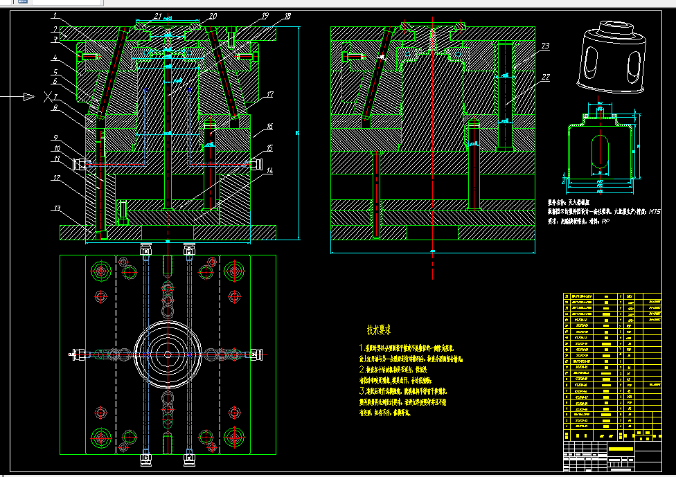 我的设计题目为灭火器桶座,其有4个侧孔、1个阶梯孔,需要有4个侧向抽芯机构、2个型腔、1个型芯来完成,总体来说本设计较为复杂。