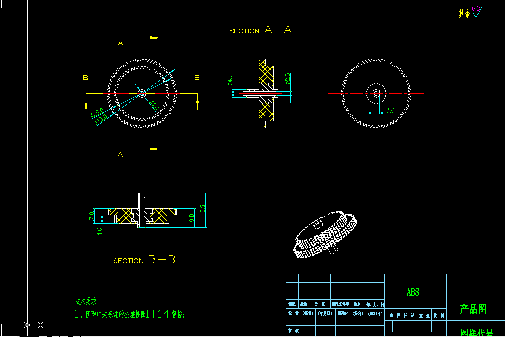 塑料是一种可塑性的合成高分子材料,具有重量轻且坚固,耐化学腐蚀, 电绝缘性好,价格便宜,可塑性好等特点,广泛应用于电脑、手机、汽车、电机、 电器、家电和通讯产品制造中。 注塑成形是成形塑件的主要方法之一, 是指使用注塑机将热塑性塑料熔体在 高压下注入到模具内经冷却固化获得产品的方法。注塑的优点是生产速度快,效 率高,操作可自动化,能成型形状复杂的零件,特别适合大量生产。 本次毕业设计的产品为小模数双联圆柱直齿轮,具有重量轻,强度高,耐腐蚀,易清洁等 特点,为大批量生产产品。本次设计在针对产品进行工艺性分析后,确定模具分 型面、 型腔数目、 浇口形式、 位置大小; 其中最重要的是确定型芯和型腔的结构, 以及它们的定位和紧固方式。此外还进行了脱模机构的设计,合模导向机构的设 计,冷却系统的设计等。最后绘制完整的模具装配总图和主要的模具零件图及编 制成型零部件的制造加工工艺过程卡片。实践证明:该模具结构合理、可靠,并 能保证产品质量,对此类注塑产品的模具设计有参考价值。