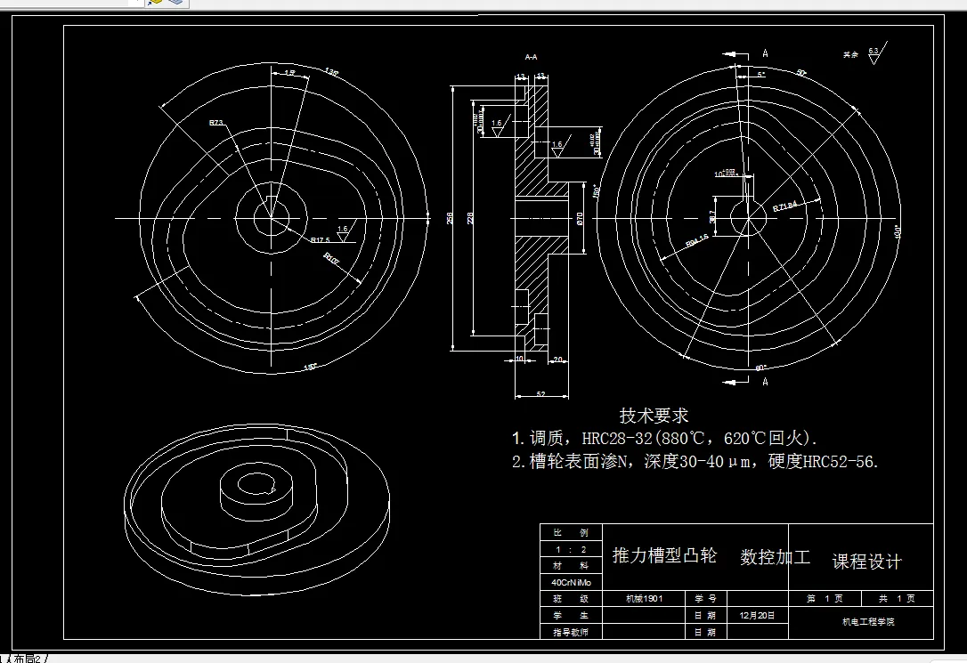 数控加工课程设计是学习完数控加工以及相关课程之后的一个实践性教学环节,通过该课程设计将在课堂上学习的相关理论知识具体地应用到一个零件的工艺过程设计上。该课程设计主要内容是零件制造工艺规程设计和数控加工设计。